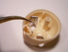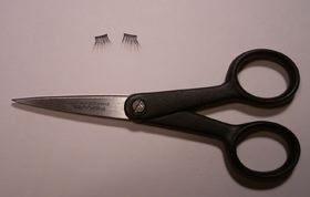 カールさせたまつげを5〜6mm程度にカットします。 ハサミは東急ハンズで買った糸切りバサミ。 ドールのヘアカットの為に購入した物で、 先が細くて髪の毛1本でも楽にすくえるのでとっても便利。 |